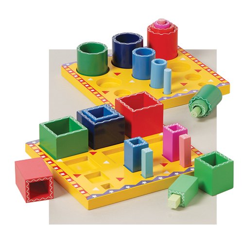 By placing the circular and square wooden tubes one inside the other or into the correct receptacles in the tray children explore both color and size gradation Each tray is 8 Sq Tallest tube is 2 14 H x 2 14 Diam 26 pc Set Ages 3 yrs Read More..