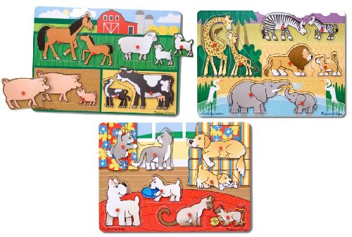 pbMelissa and Doug Peg Puzzle 3-Puzzle BundlebppYour child may be inspired to make happy animal sounds while matching the mother and baby animals in this kid-powered wooden puzzle Easy-grasp pegs and pictures under the pieces will help your child solve this set of three simple 8-piece p Read More..
